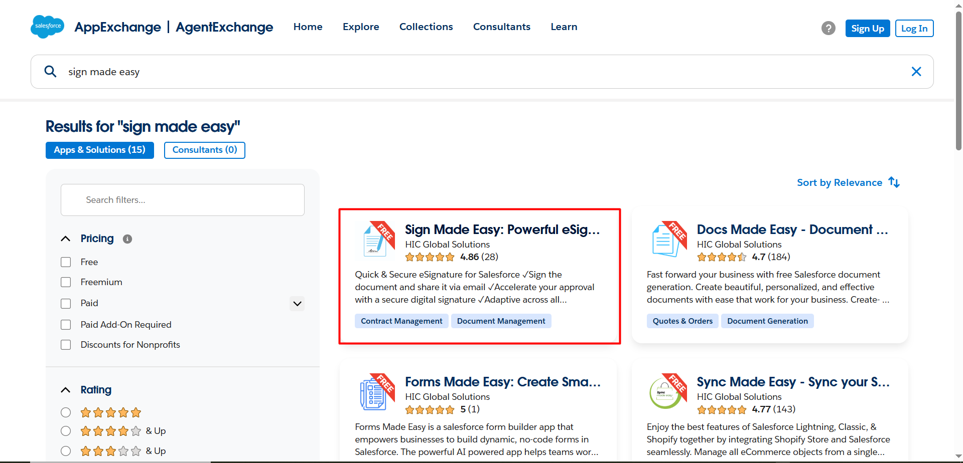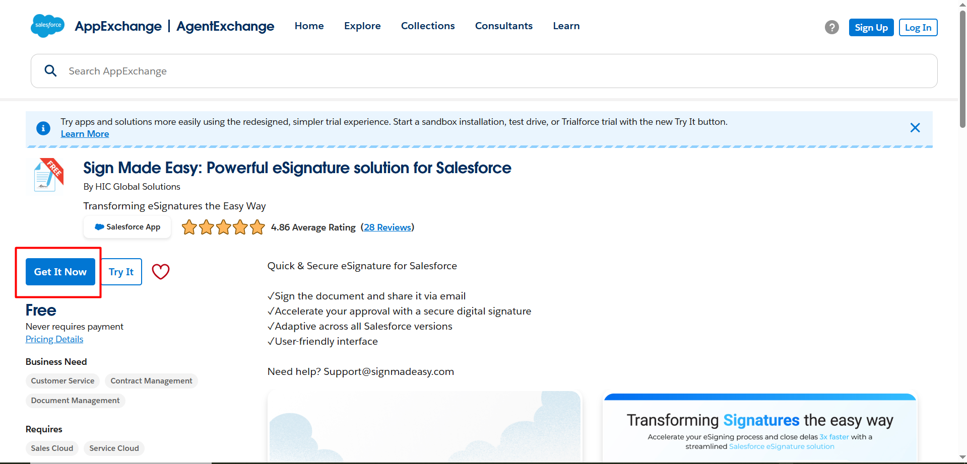 Step 1: Visit Salesforce AppExchange and search for ‘Sign Made Easy’ in the search bar. Then, click the ‘Get It Now’ button to proceed.