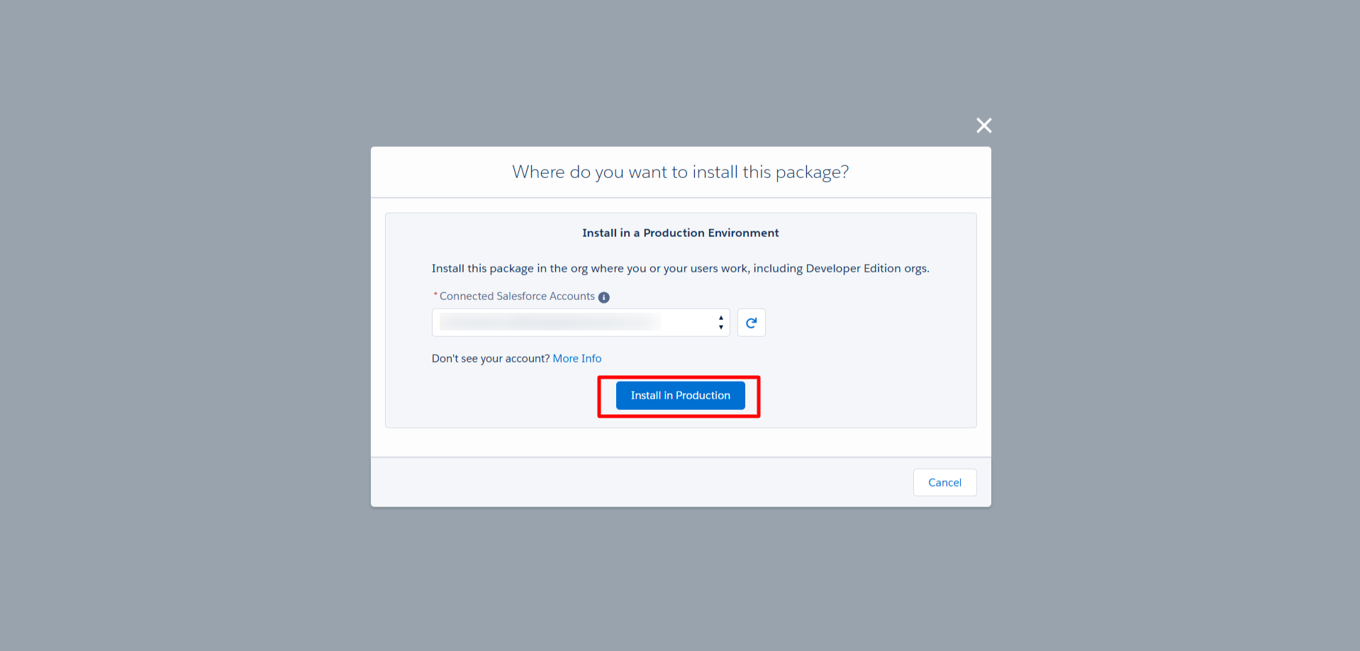 - If you are installing in a production environment, the “Install in Production” button will be displayed.