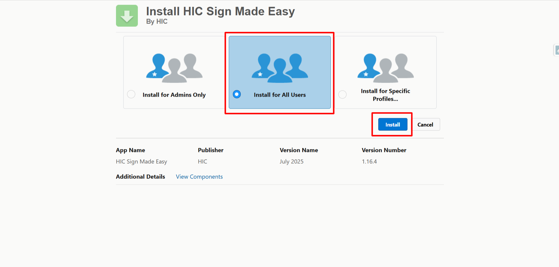 - Install for All Users – Grants access to all users in your org.