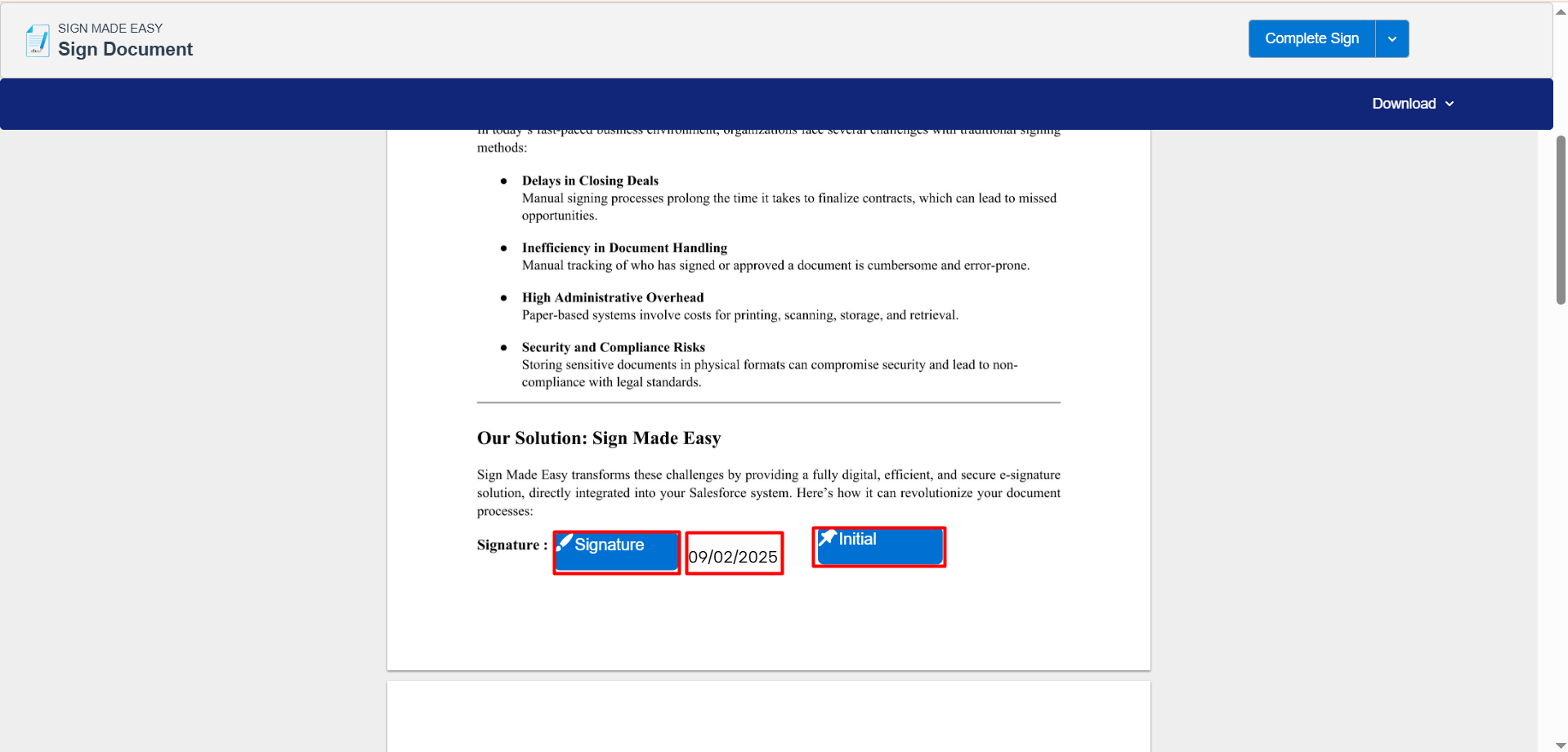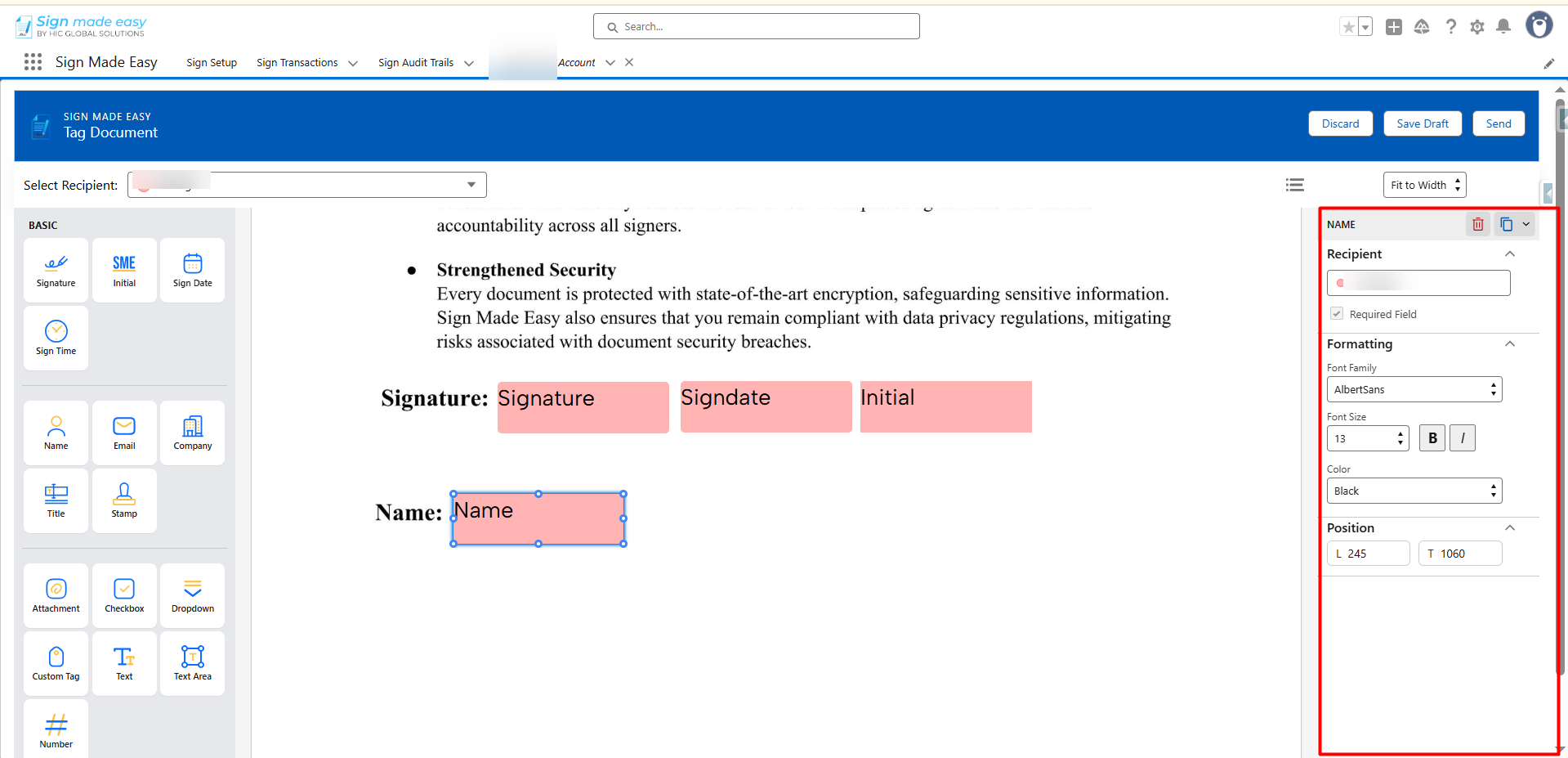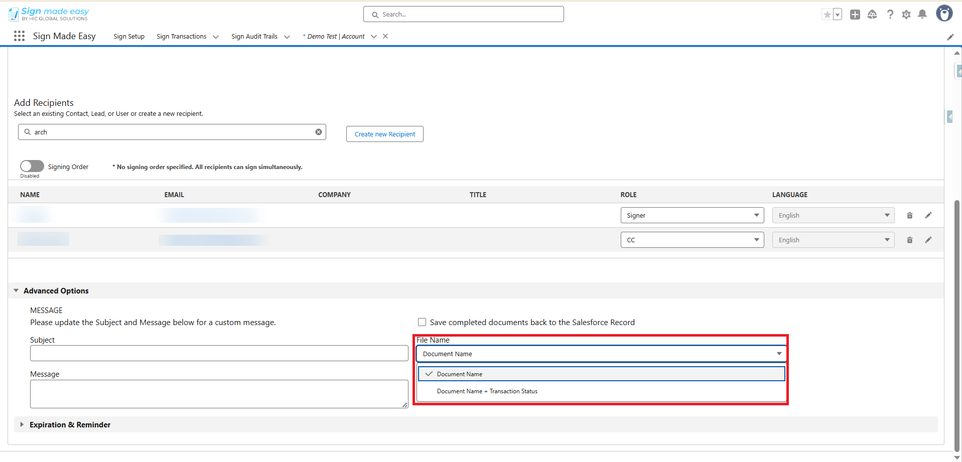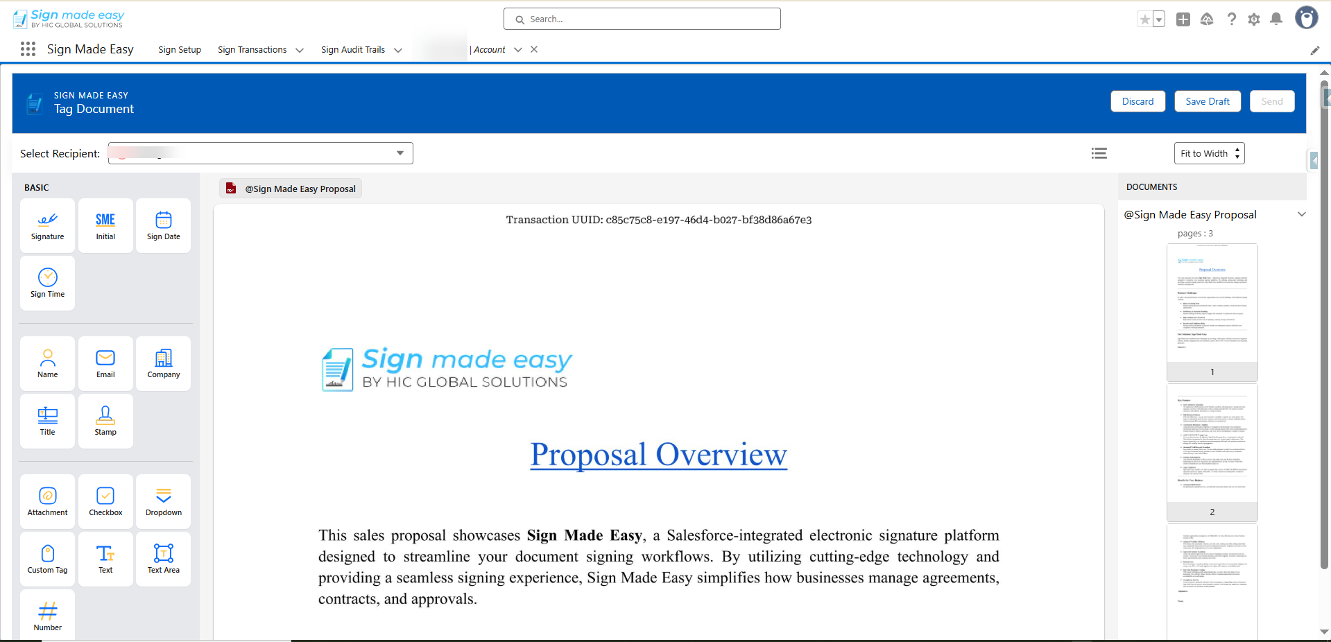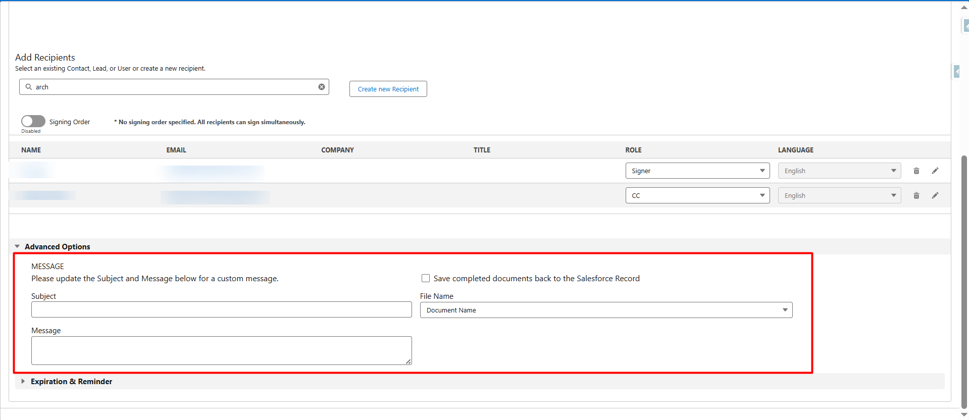 • This section enables you to provide recipients with clear, customized communication while ensuring that completed documents are seamlessly stored in Salesforce for future reference.