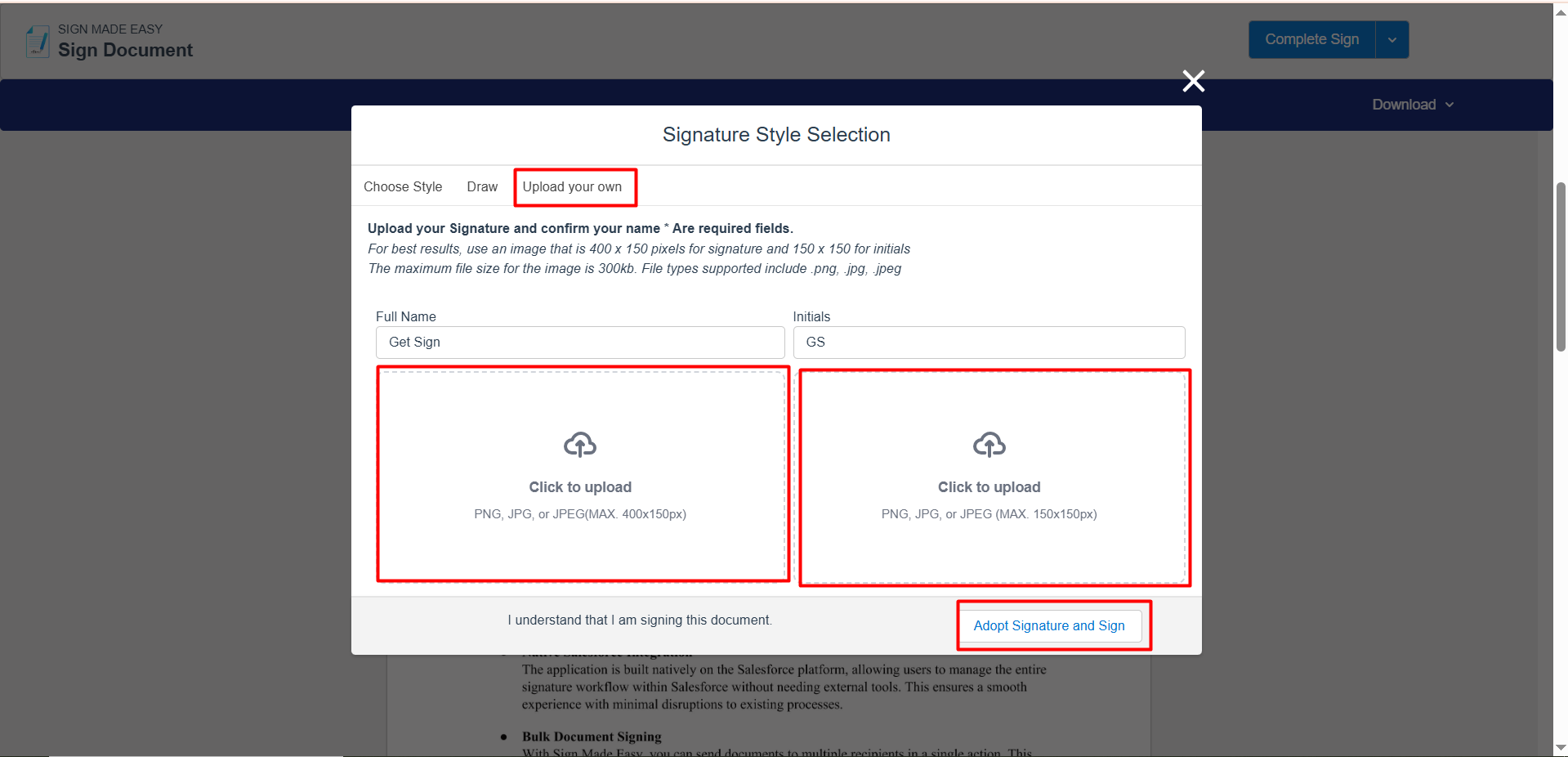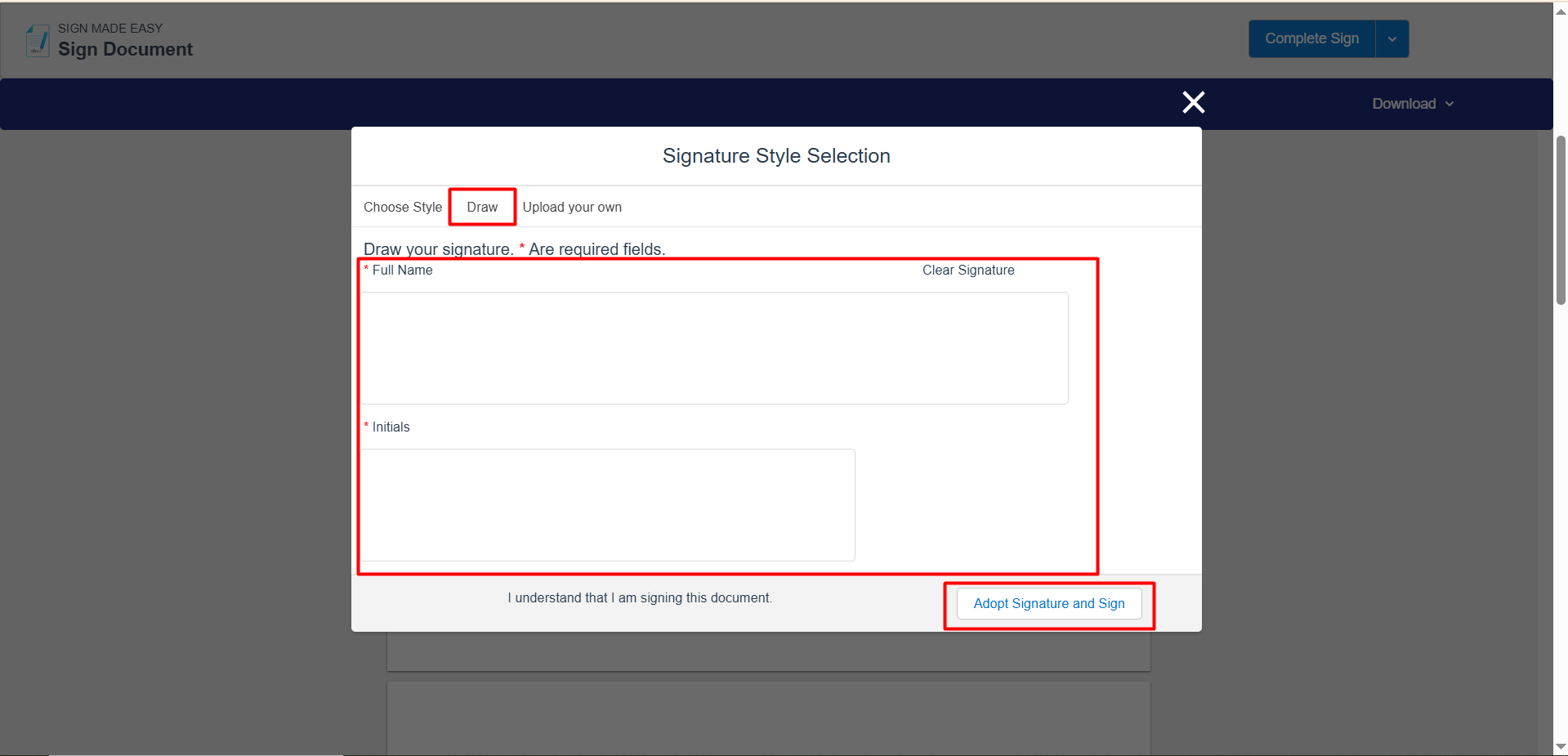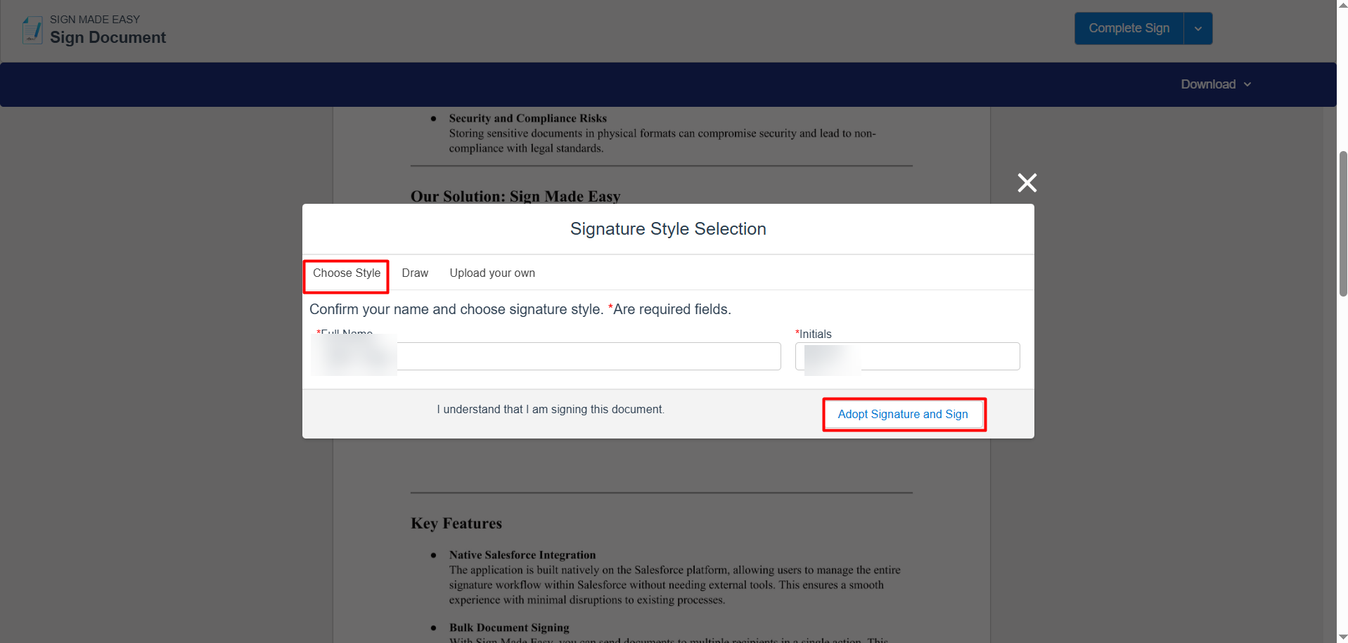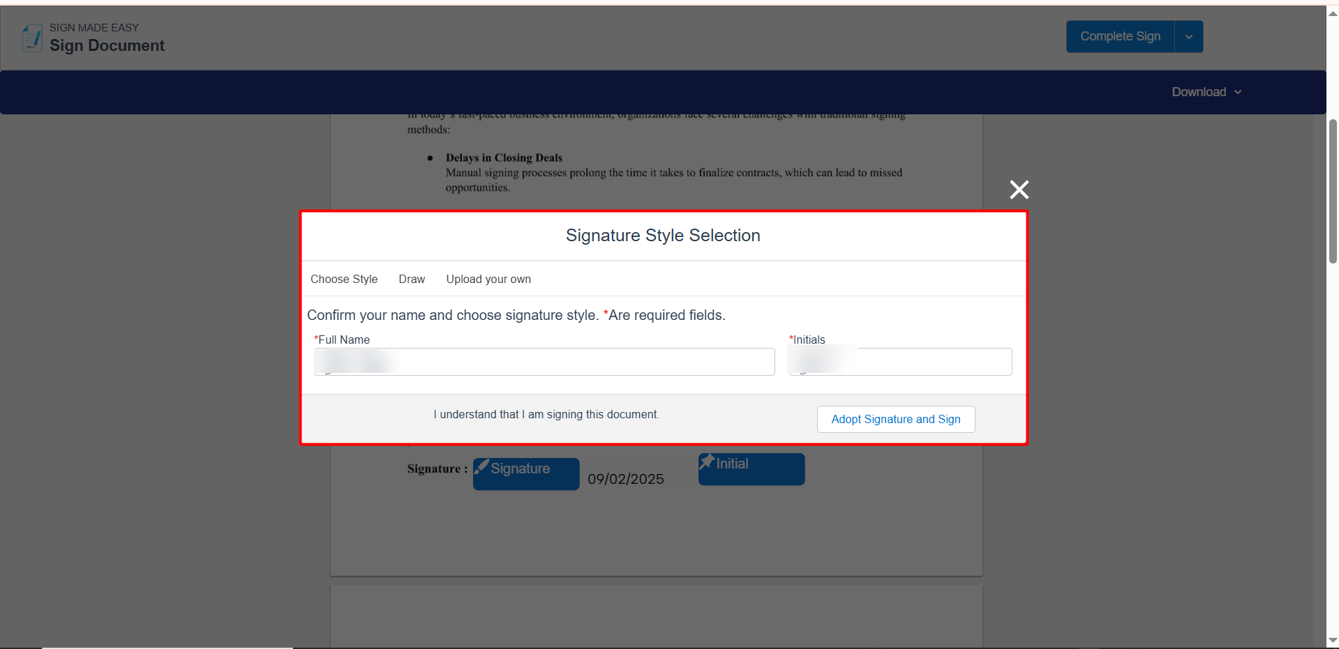 After completing the required fields, click Adopt Signature and Sign button to apply the chosen style and proceed with signing the document.