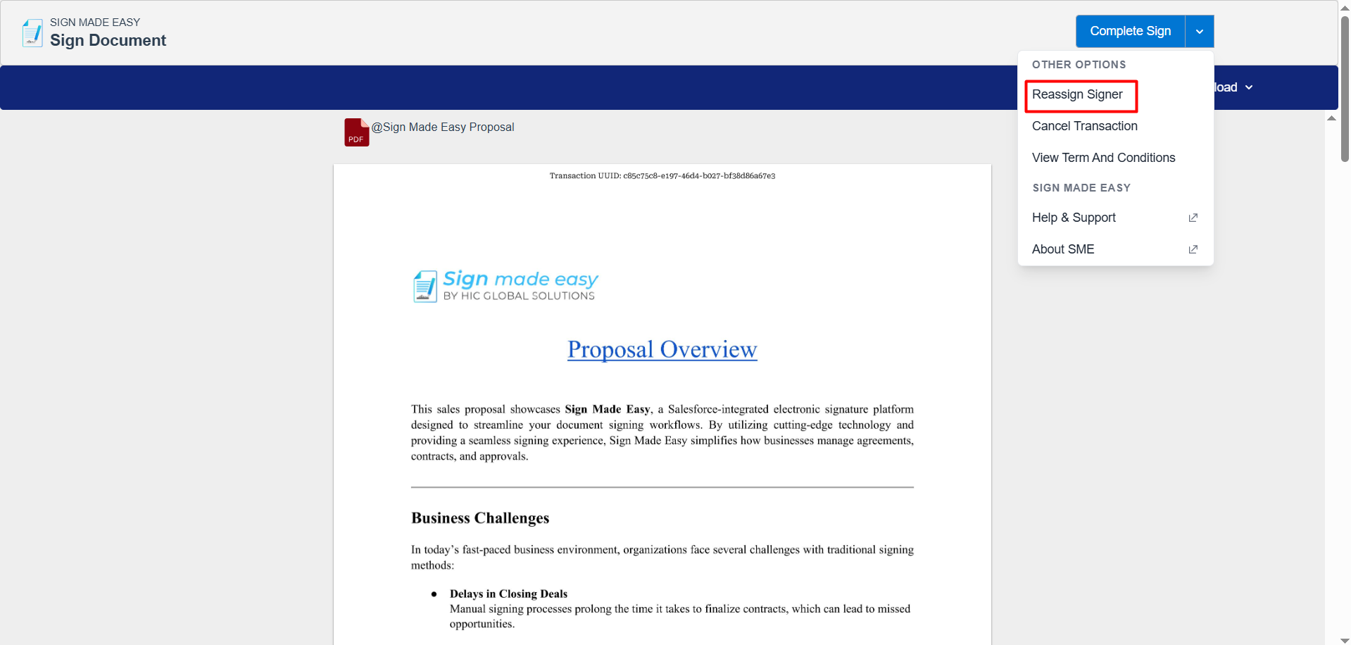 Reassign Signer :-  Delegate the signing responsibility to another authorized recipient.