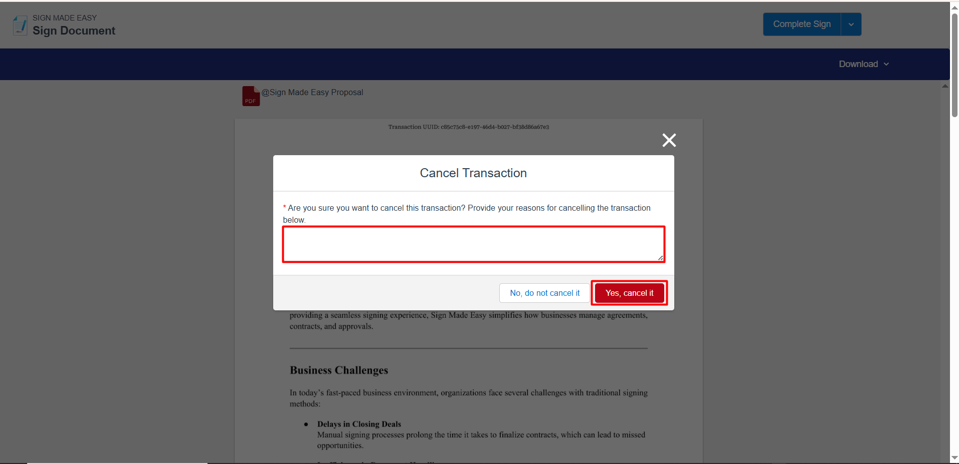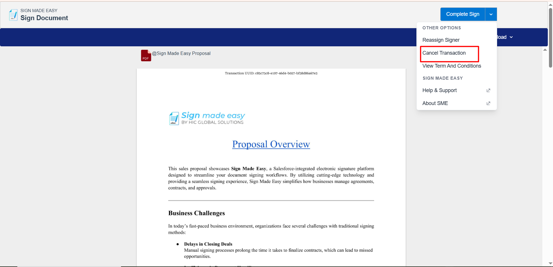 Cancel Transaction :- Terminate the ongoing signing process for the current document.