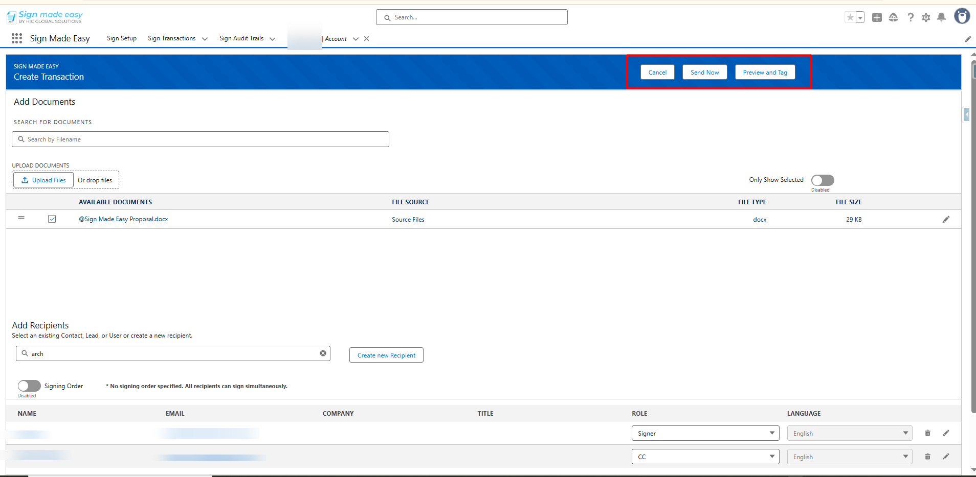 Note:- You can add multiple Signers, CCs, and In-Person Signers within a single transaction record. however, maximum of five recipients is allowed per transaction.