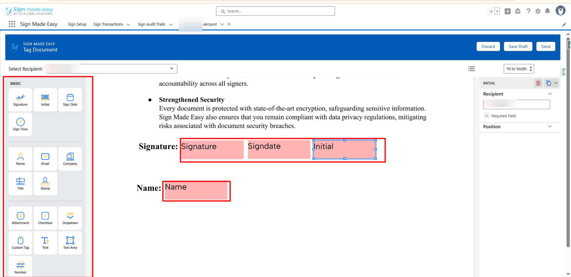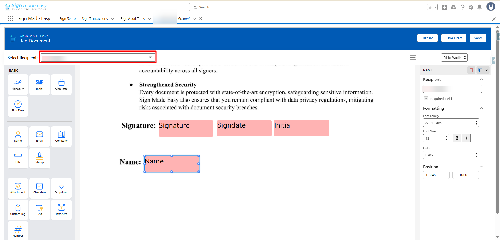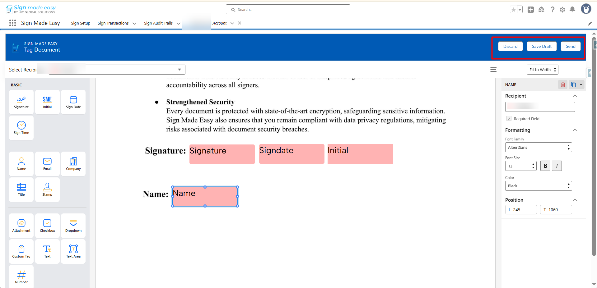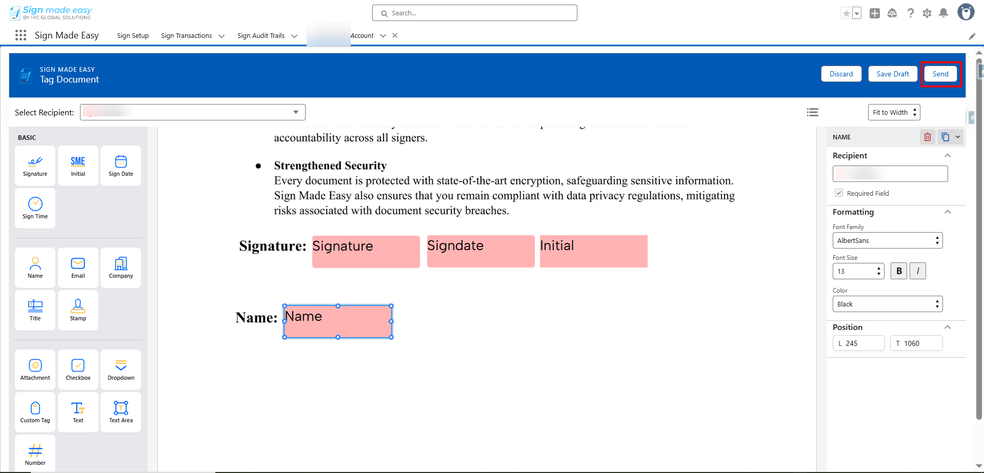 • Preview and Tag:- Click this button to open the tagging interface. You can add tags by dragging and dropping them to the appropriate locations in the document before sending it to recipients..