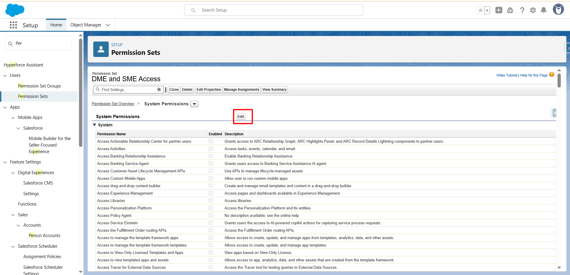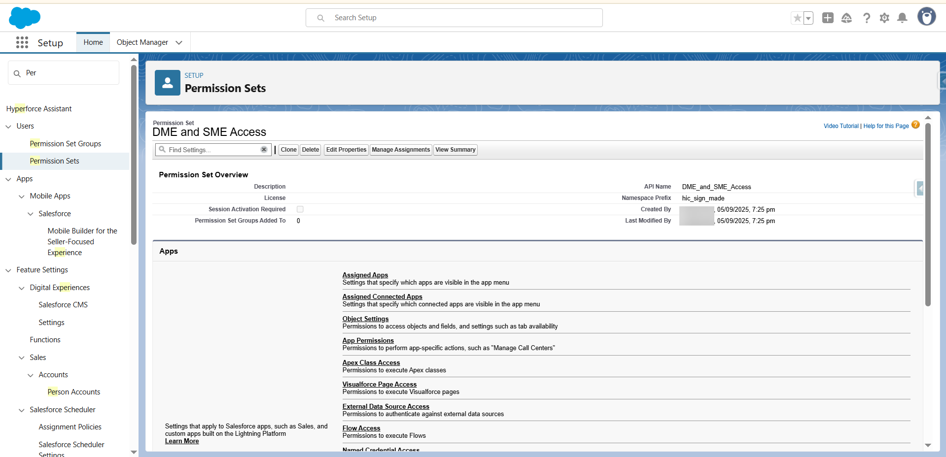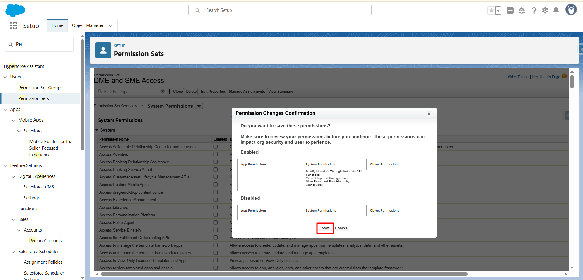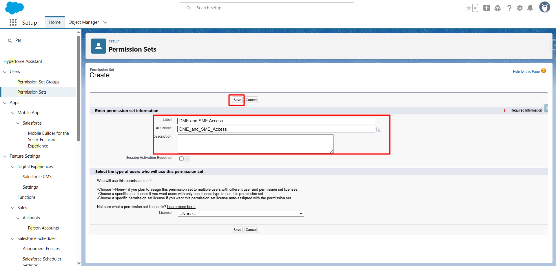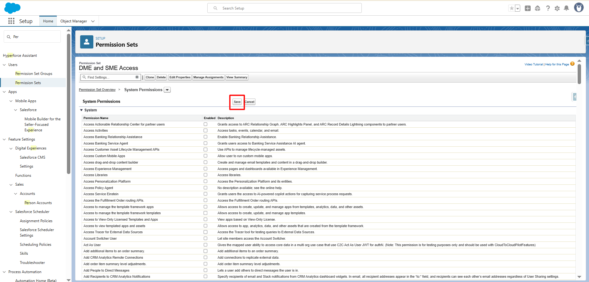 The permission set has now been successfully created. To enable non-admin users to use the DME and SME integration, assign this permission set to them as well.