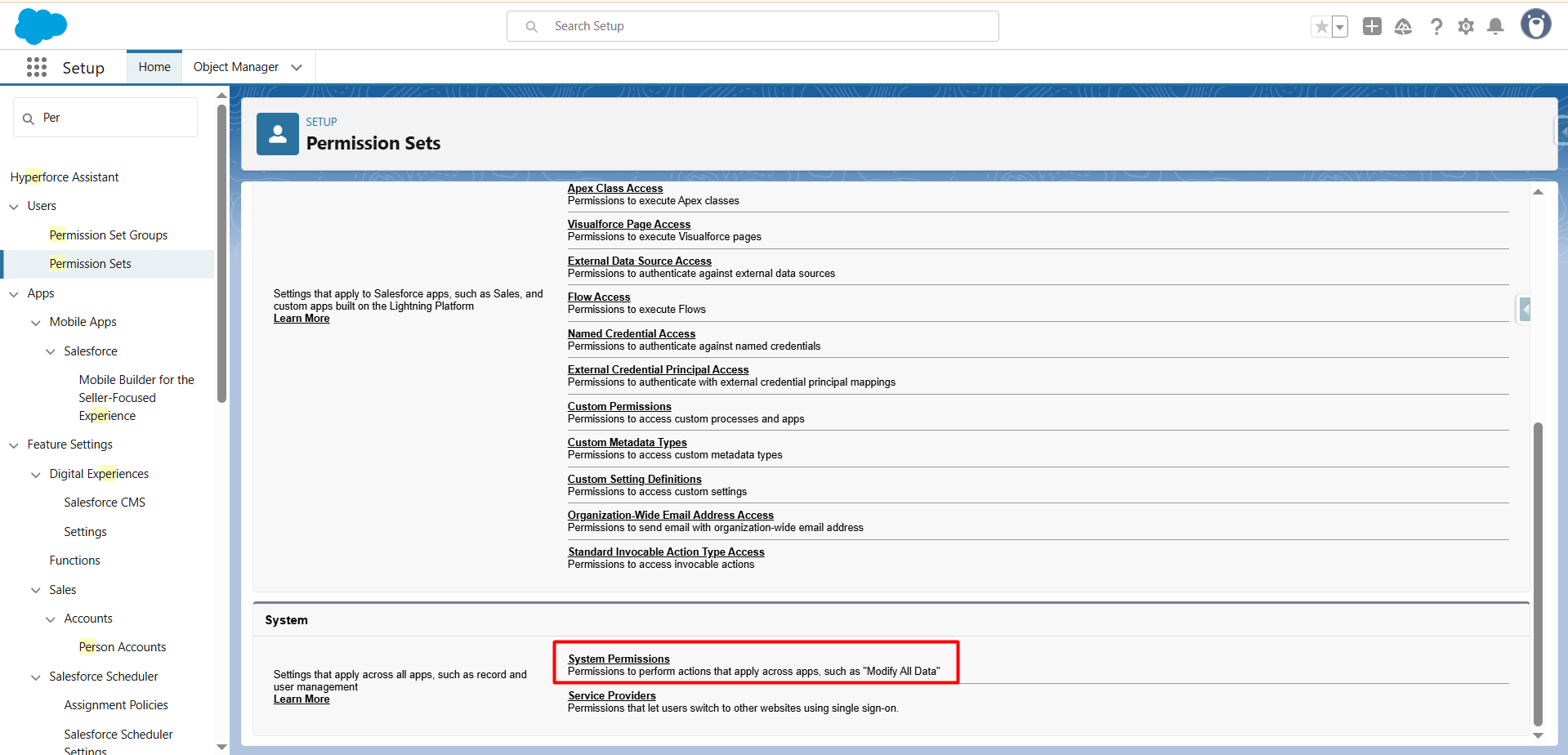 Step 4 :- Within the same permission set, navigate to System Permissions.
