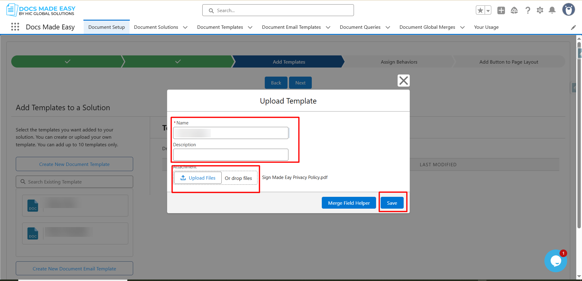 Step 4:- Upload the template, provide a desired name, and click the Save button.