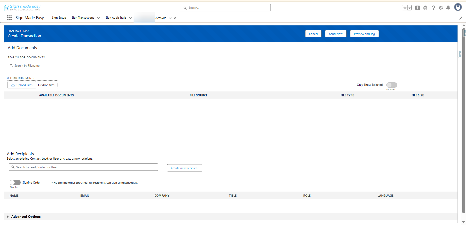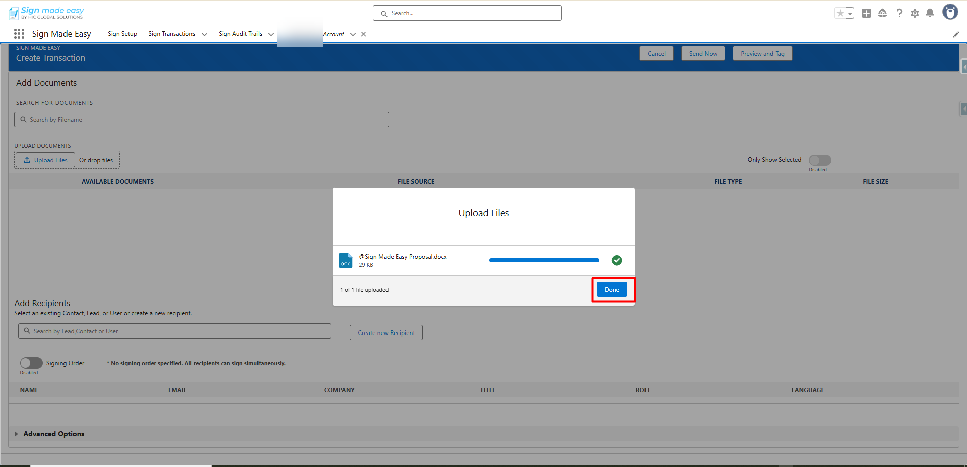 Step 3:- Next, click the button you created. The Create Transaction interface will appear, allowing you to add documents and recipient details.