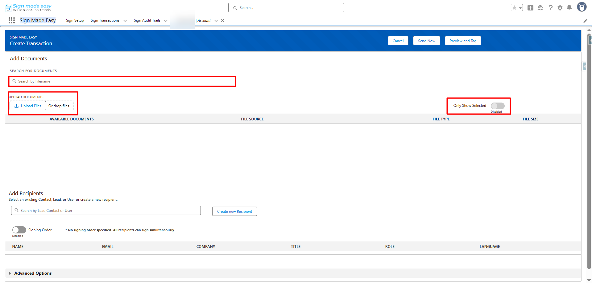 The maximum supported file size for each transaction record in Sign Made Easy is 15 MB. - To view only the selected documents, enable the Show Only Selected toggle.