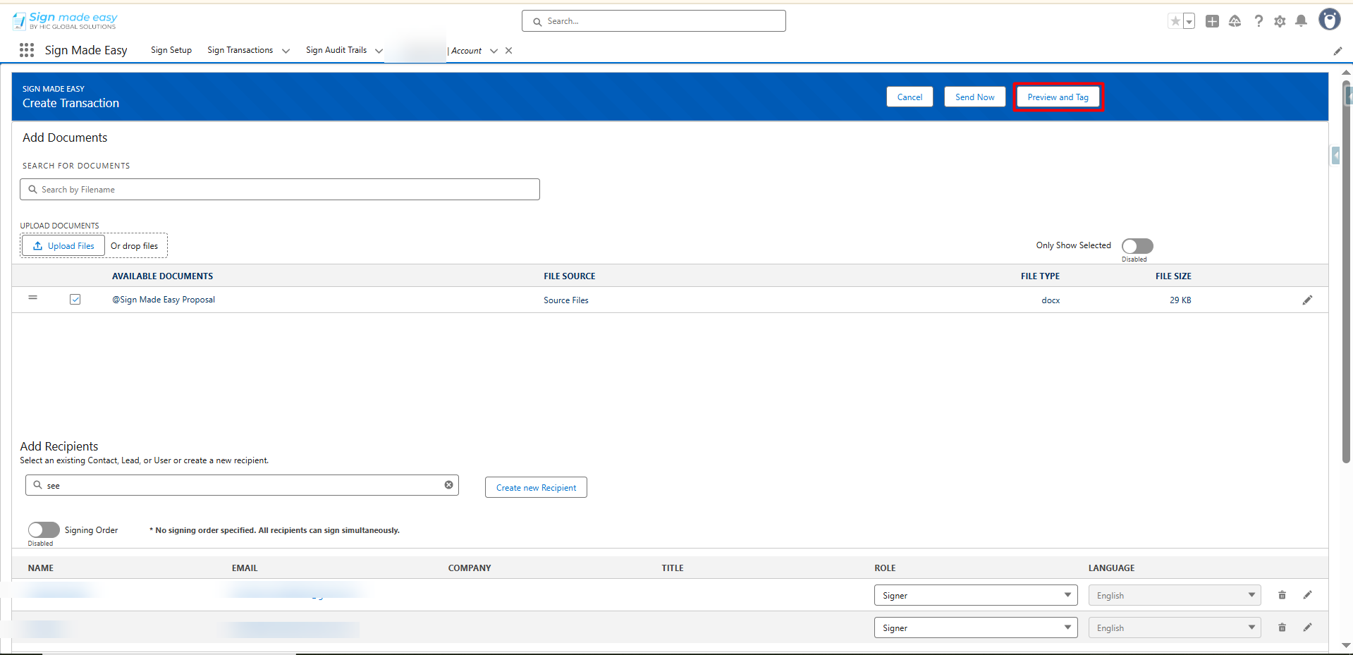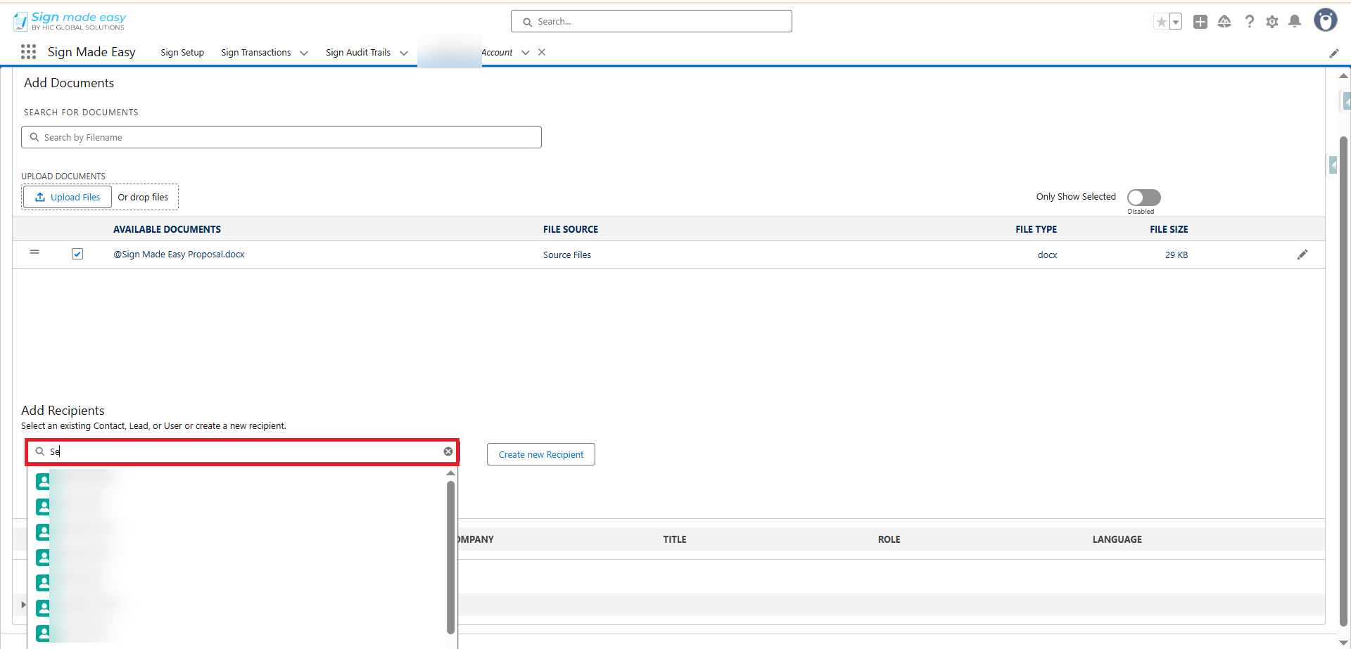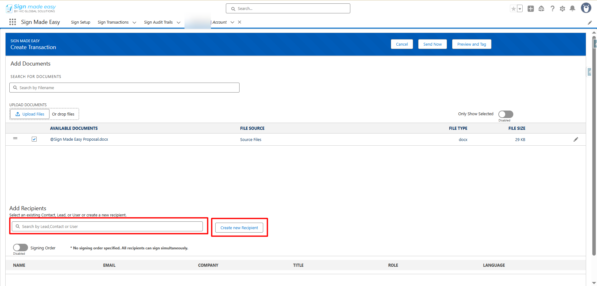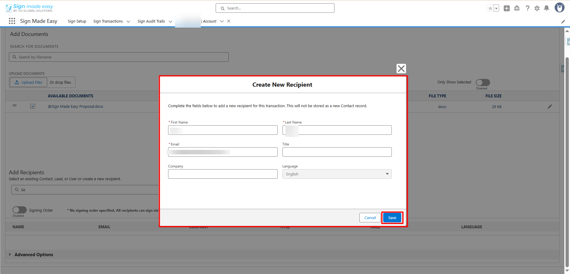 - The Create New Recipient button does not create Contact, Lead, or User records in Salesforce; it only creates Sign Recipient records.