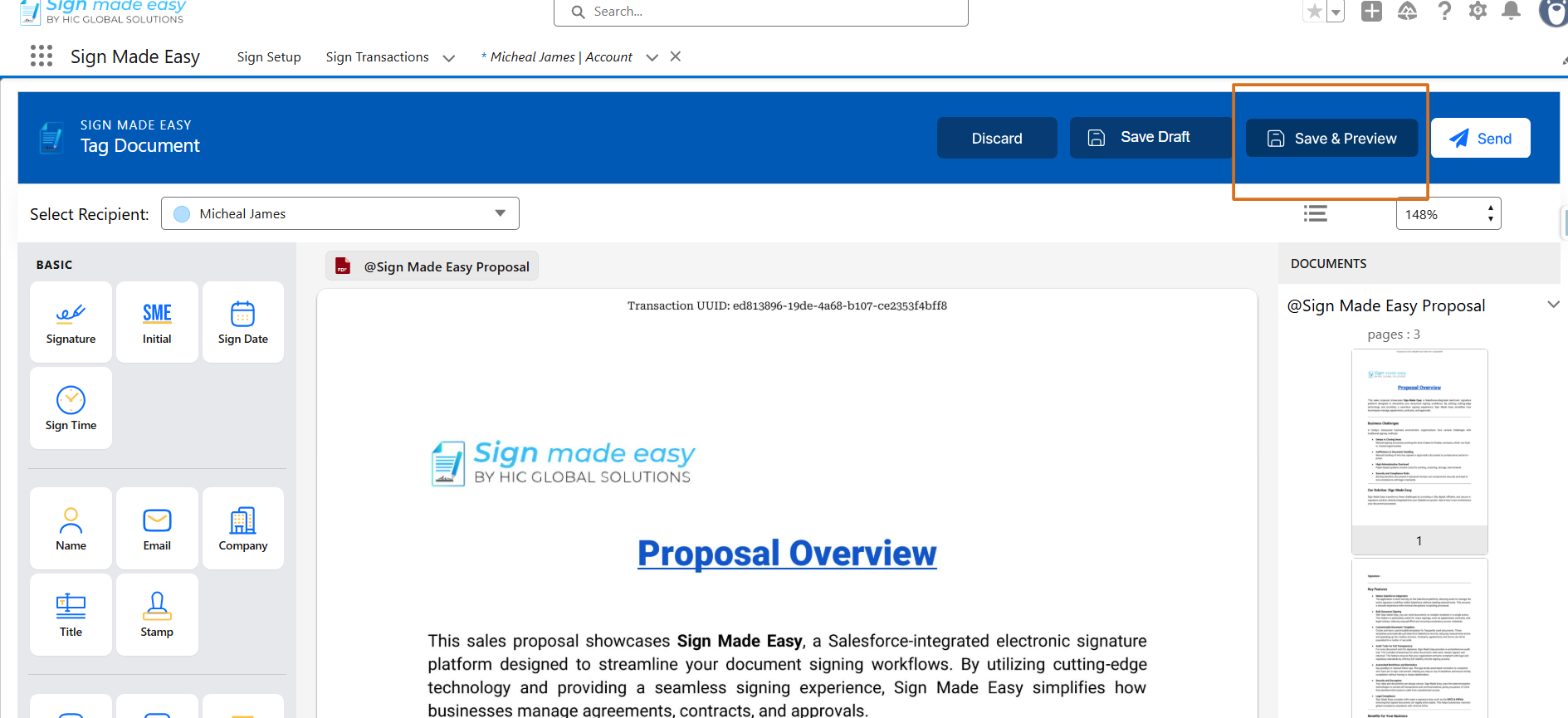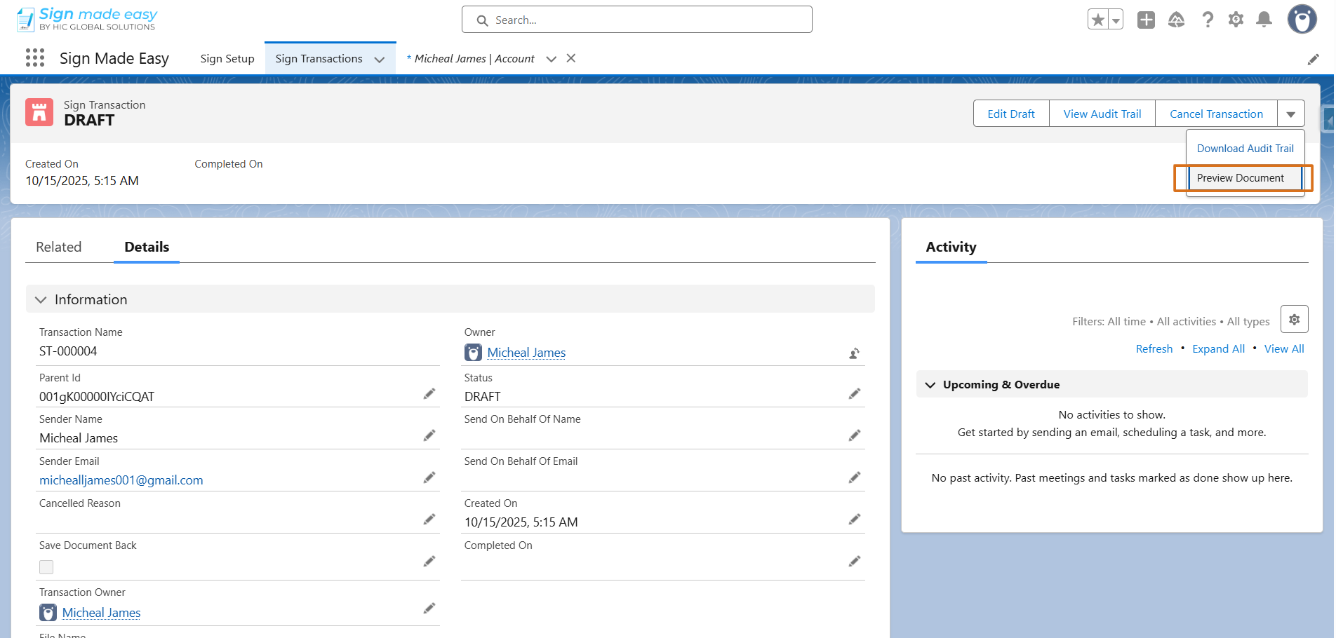You can also preview the document from the Salesforce button when your transaction is in Draft status.