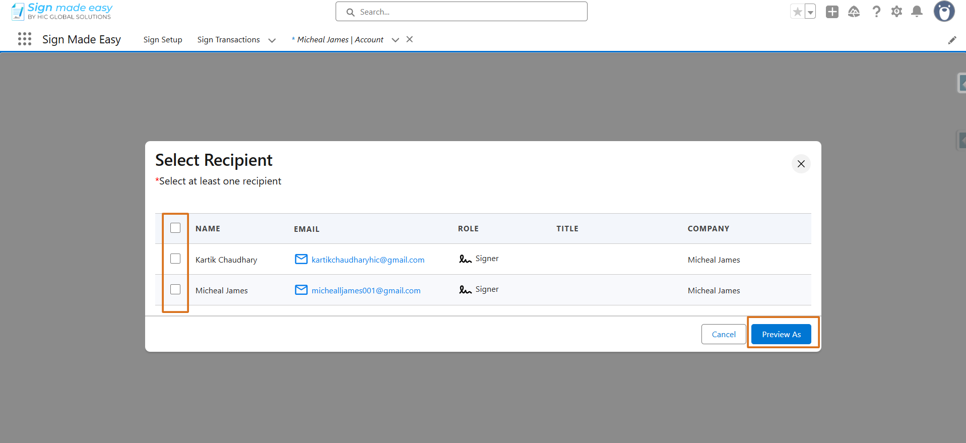 Step 7:- Select the recipient and click on the preview As button to preview the document.
