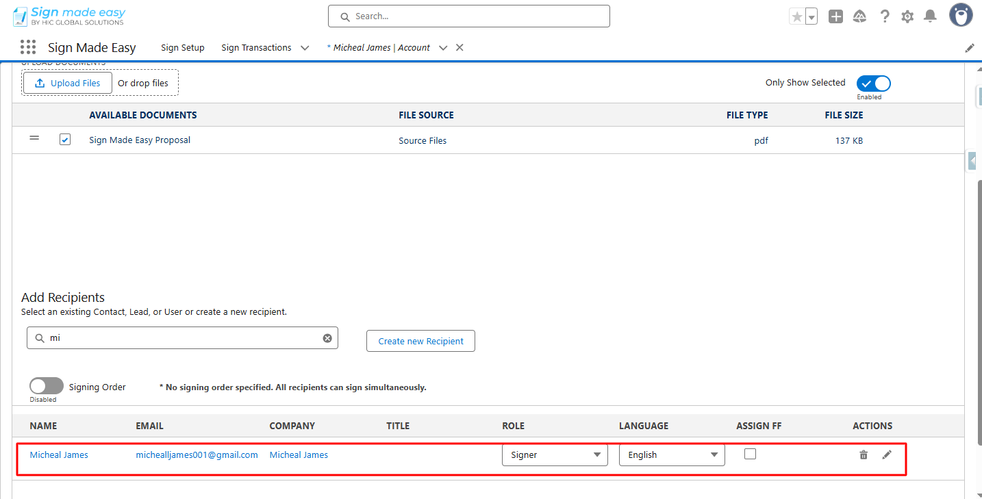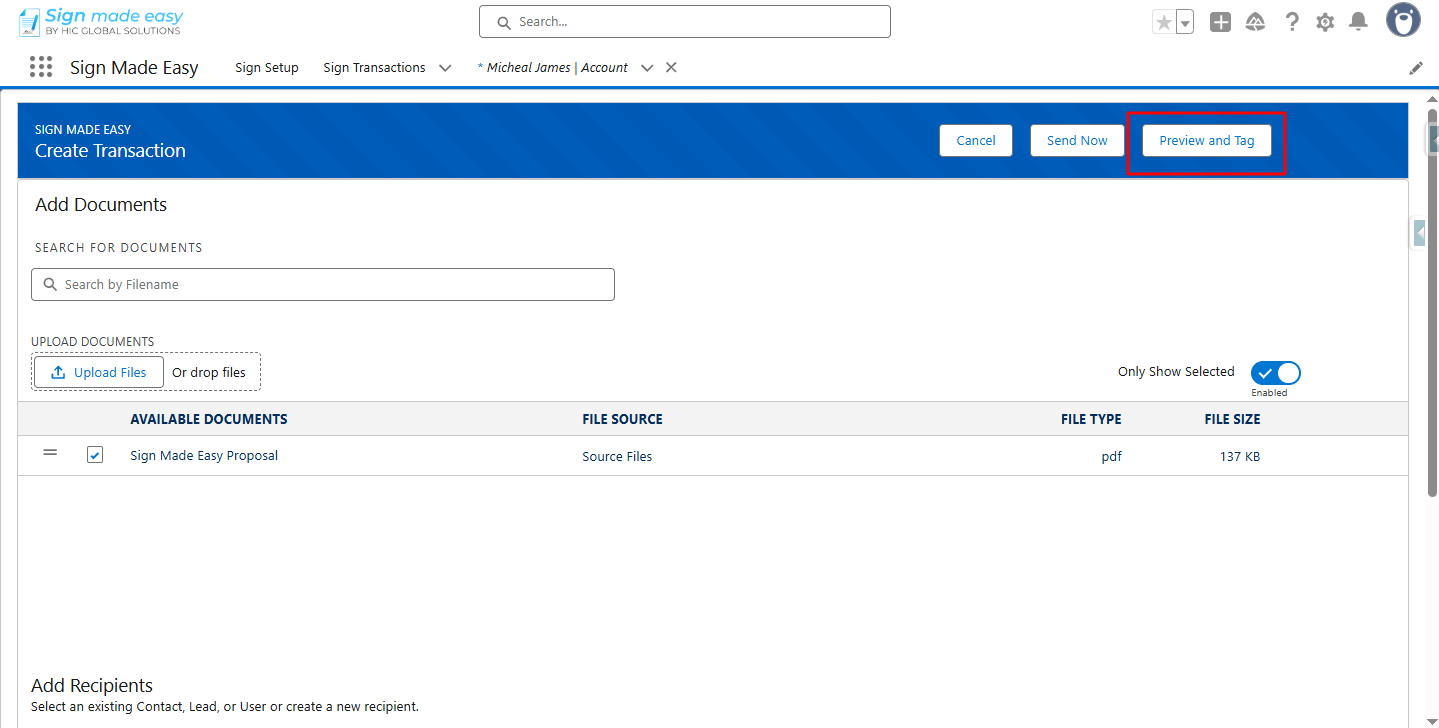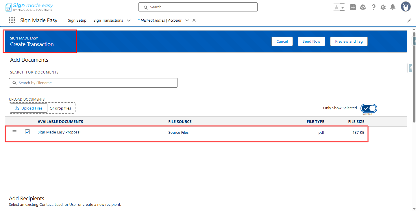 Step 7:- Click the button you created. The Create Transaction interface will appear, allowing you to add documents and recipient details.