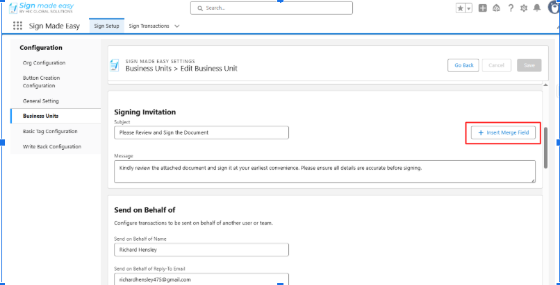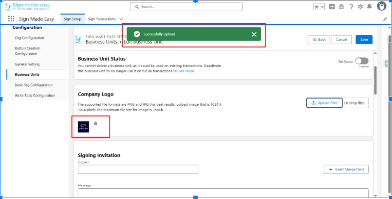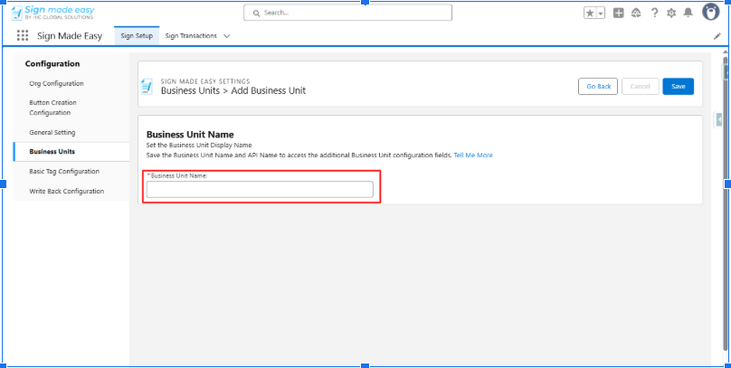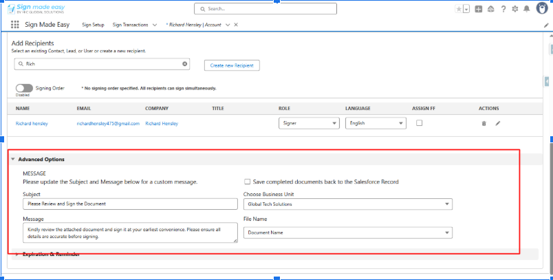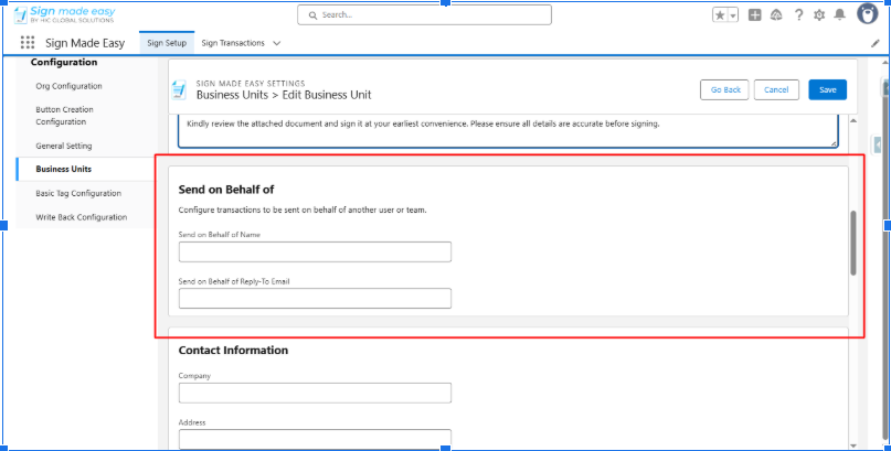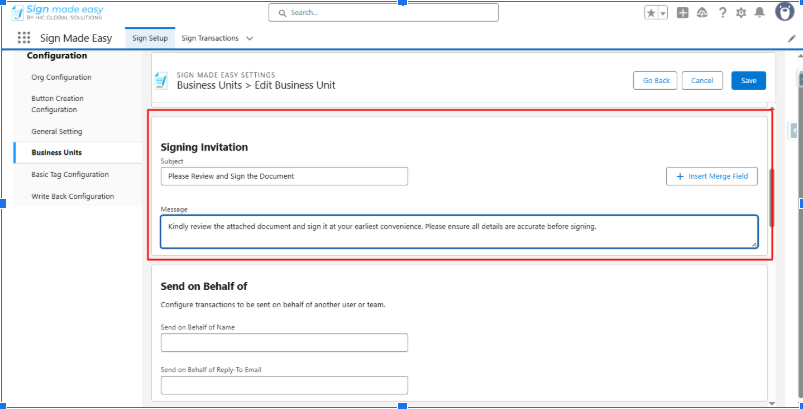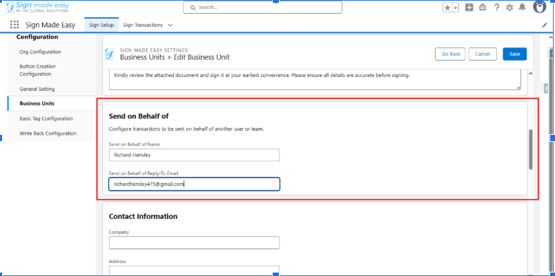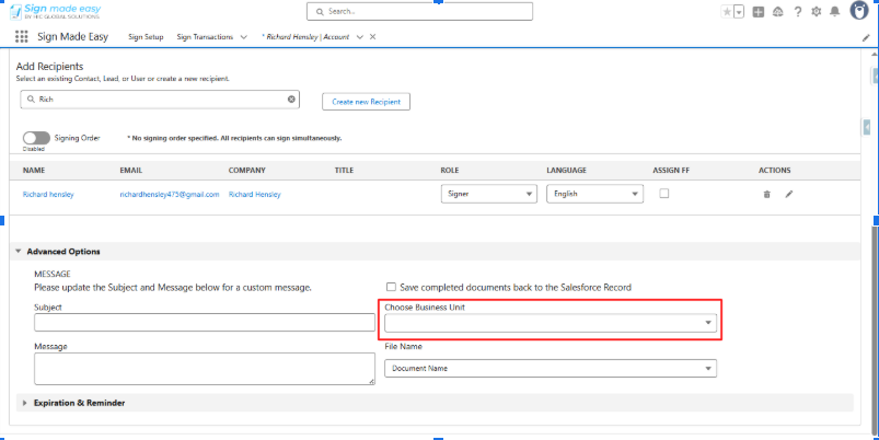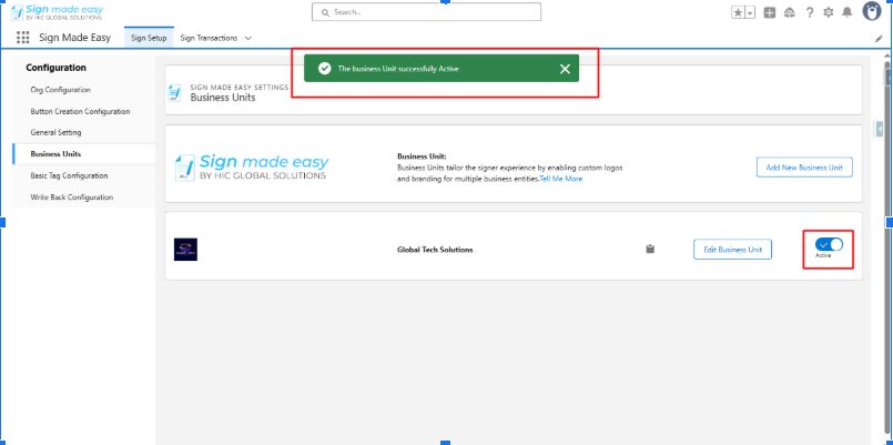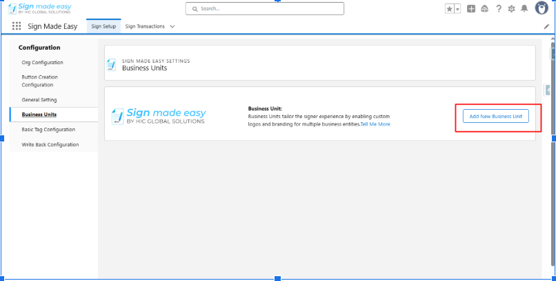 After successfully configuring the Business Unit, the next step is to send a document with the Business Unit for eSignature for Salesforce.