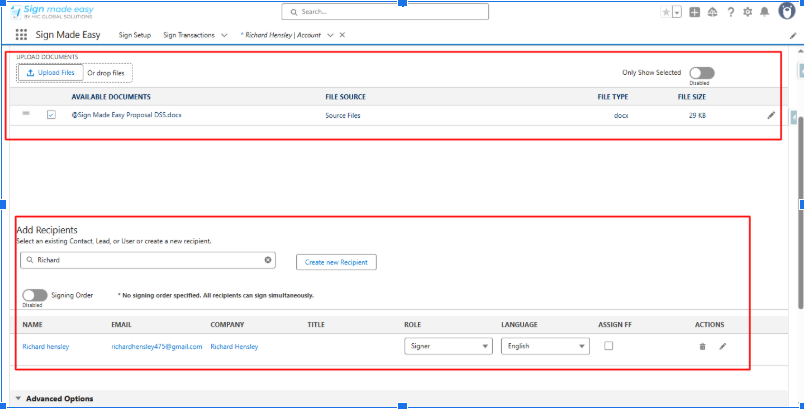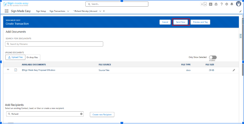 Step 2:- Next, click the button you created. The Create Transaction interface will appear, allowing you to add documents and enter recipient details.