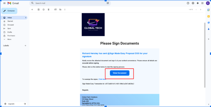 Step 6:- After the document is sent, recipients will receive an email notification. To complete the eSignature process, they must open the email and click the View Document button.