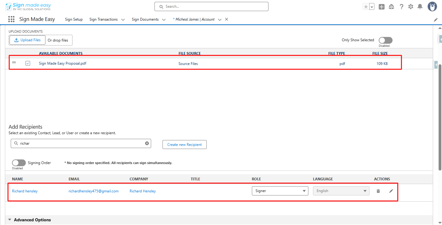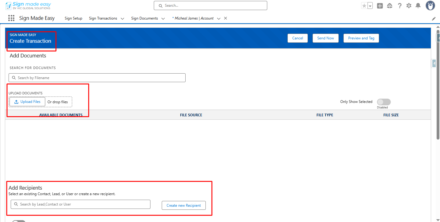 Step 2:- The Create Transaction page is launched. Upload the document and add Recipients.