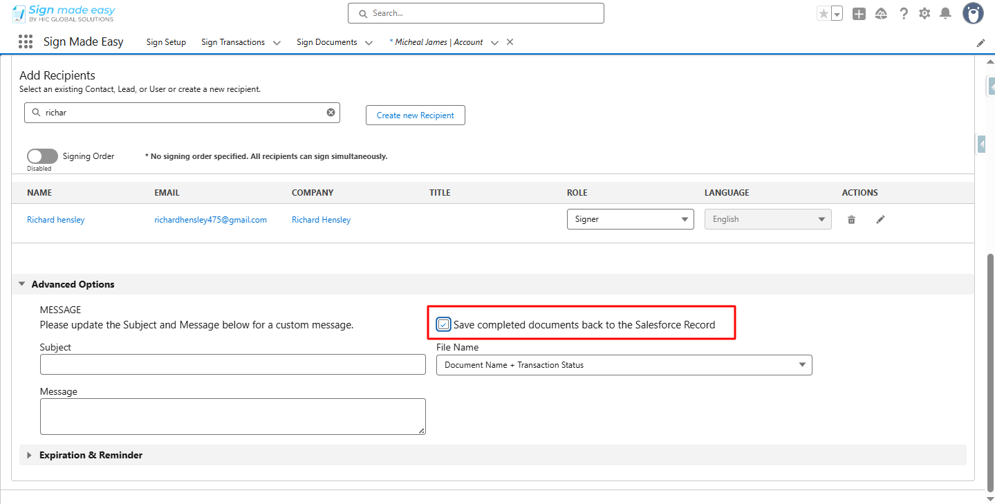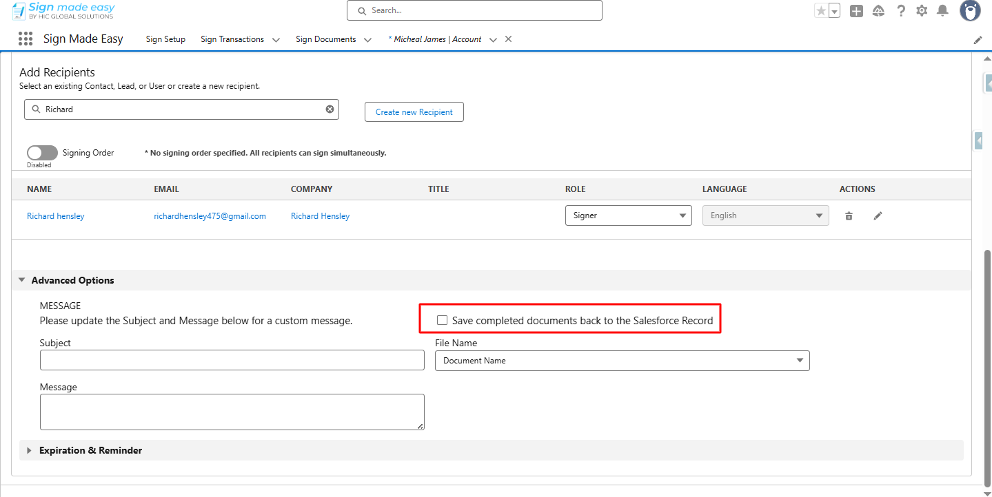 Step 3:- Select the checkbox to save completed documents back to the Salesforce Record.